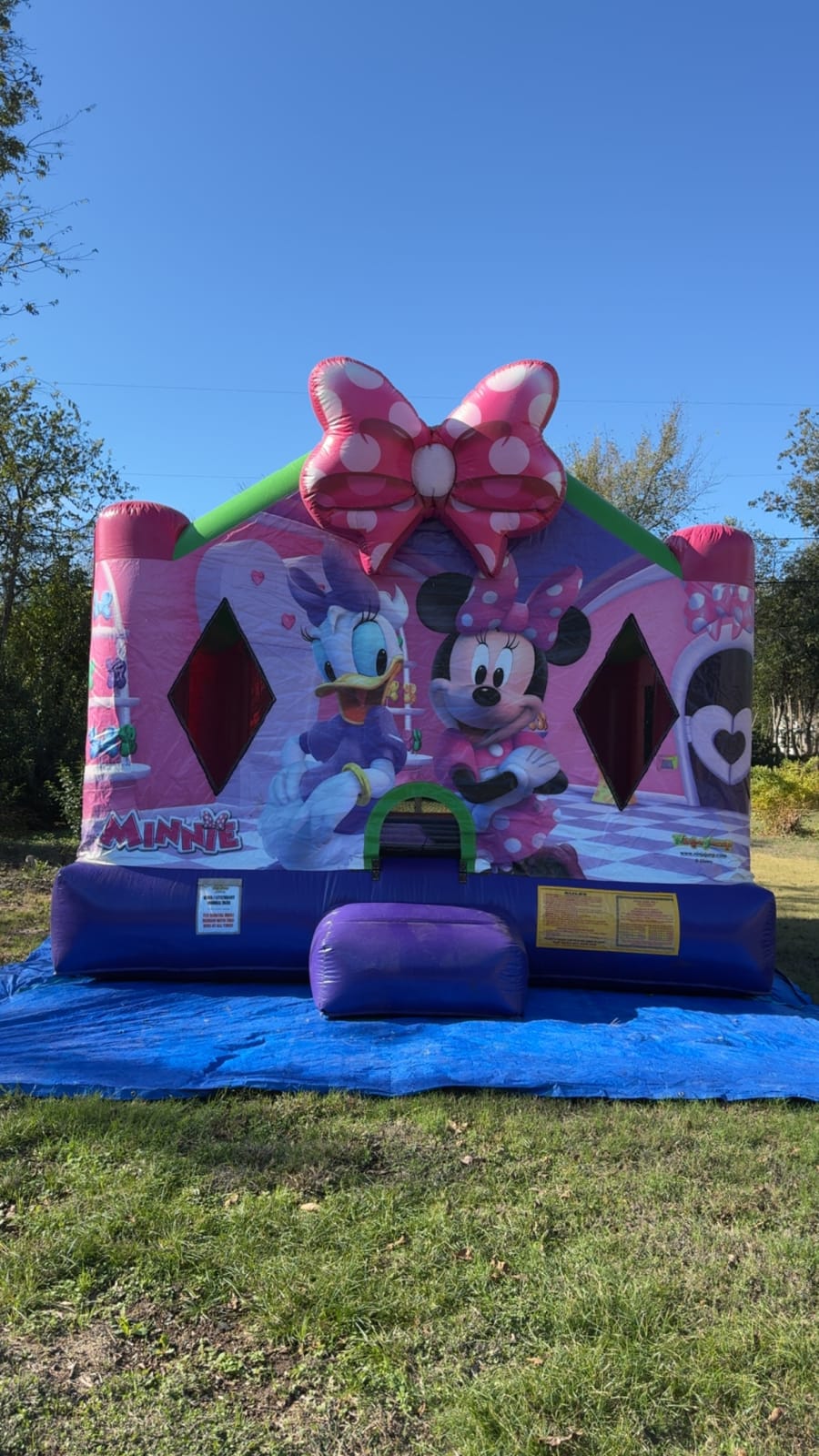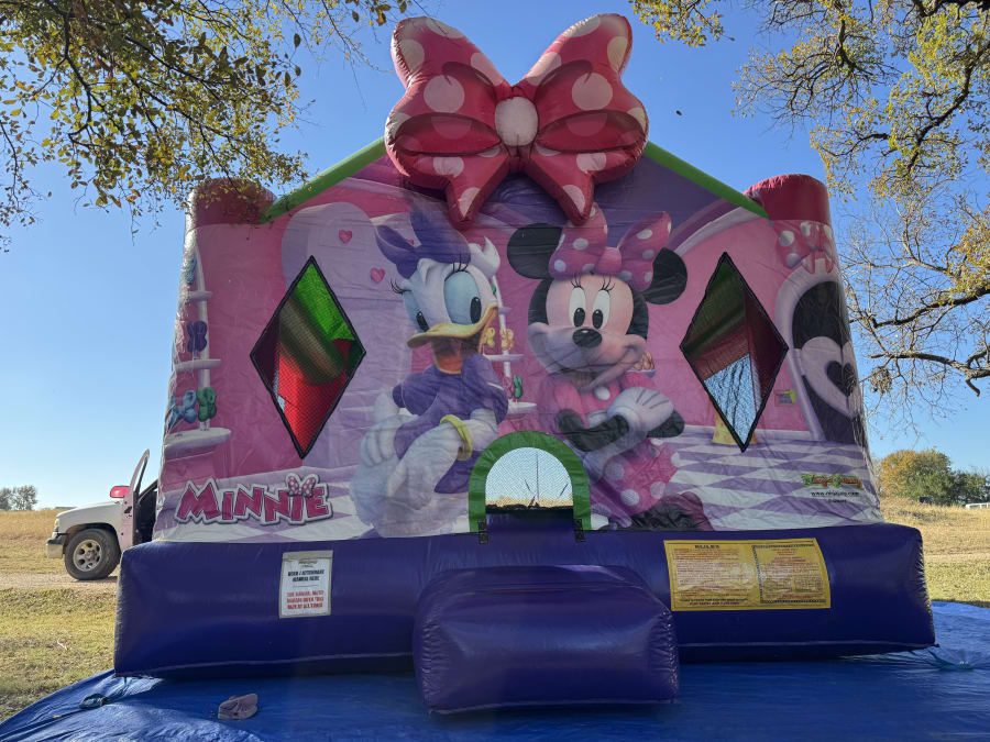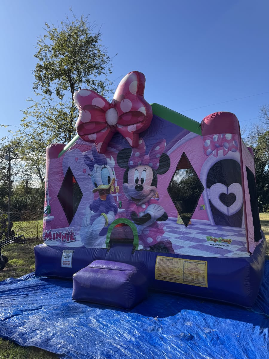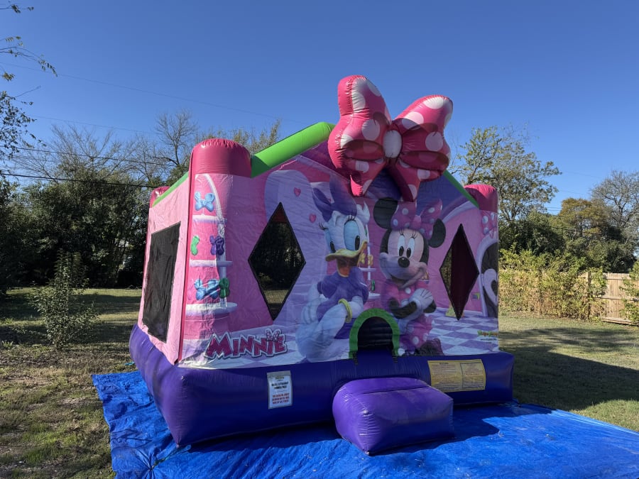 Bring bright fun to any birthday or backyard party with this Minnie Mouse Bounce House. This 15x15 inflatable features a large Minnie Mouse graphic on the front, vibrant colors, and a safe jumping area sized for groups of children. Perfect for girls of all ages, it creates instant party atmosphere.
