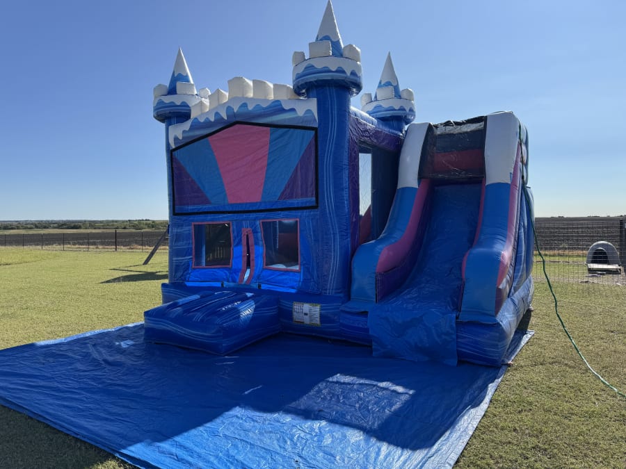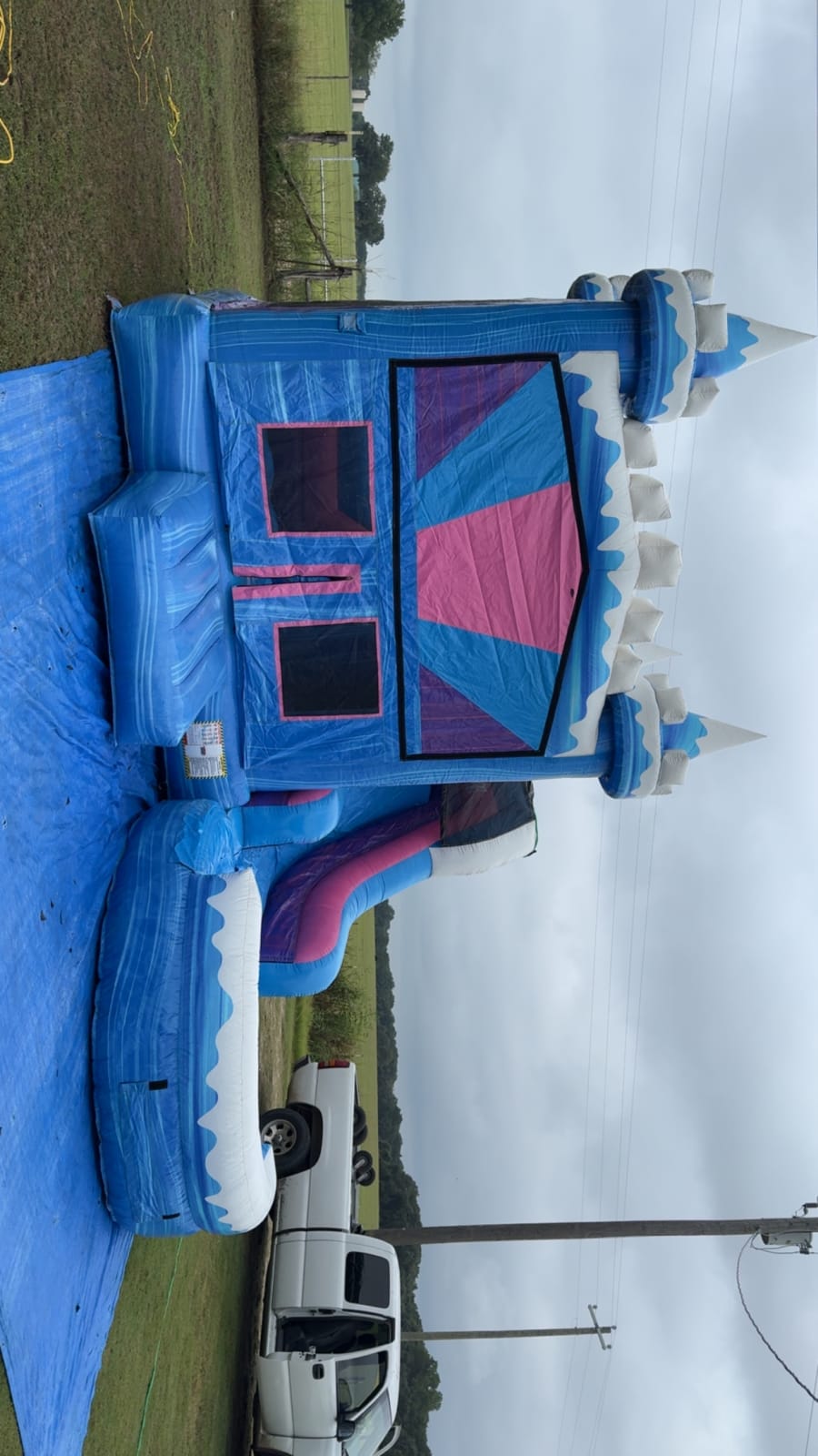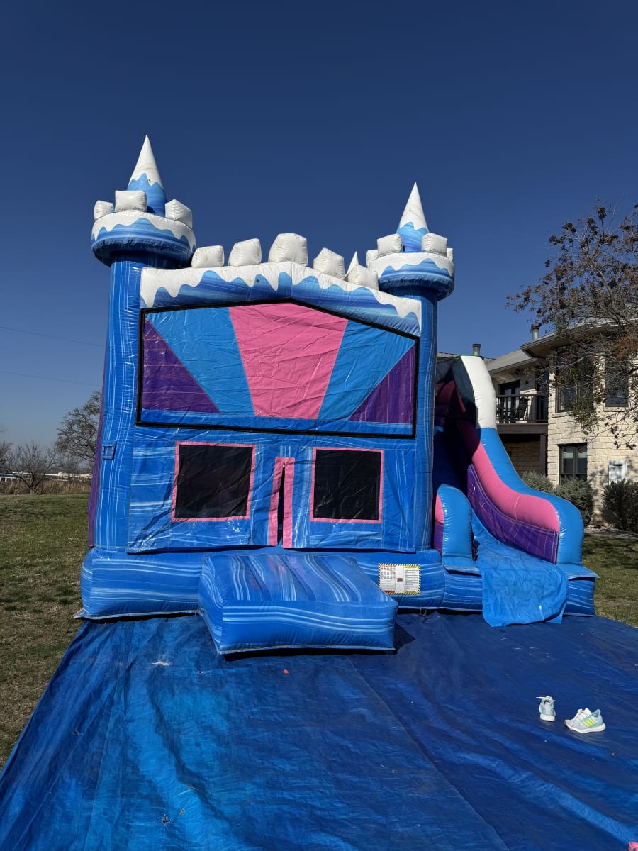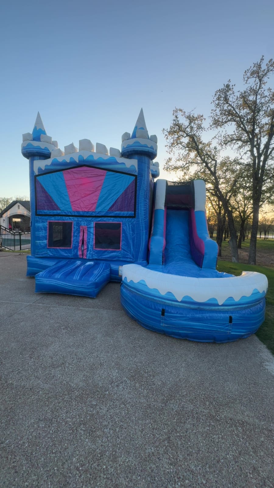 Frozen Castle Combo is a vibrant inflatable bounce house with slide and detachable pool. It measures 19 feet wide, 15 feet long, and 13 feet tall. The design mixes blue, pink, and white for a magical look. The pool attaches or detaches in seconds. Ideal for backyard parties, school events, and family gatherings.
