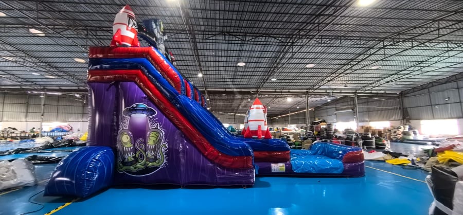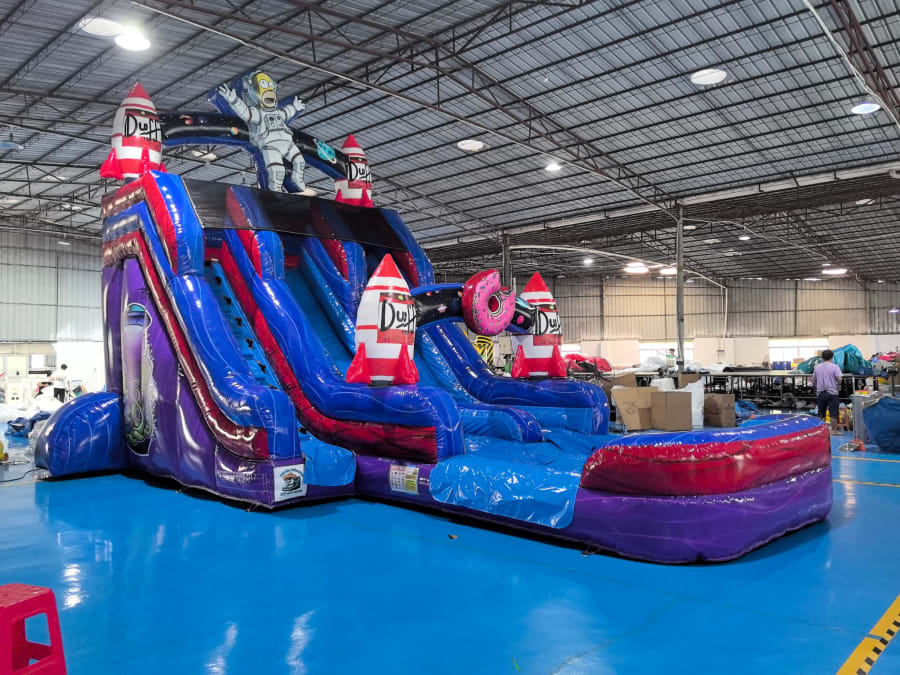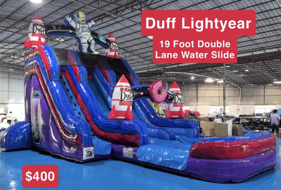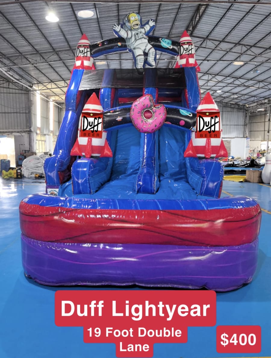 Bring big thrills to your next party with the Duff-Lite Year inflatable. This 18-foot tall, double-lane water slide delivers a space-themed Duff rocket ride complete with Homer at the top. Wet or dry, it’s built for kids, adults, dads, and Simpsons fans who want bold photos and nonstop fun. 🎉